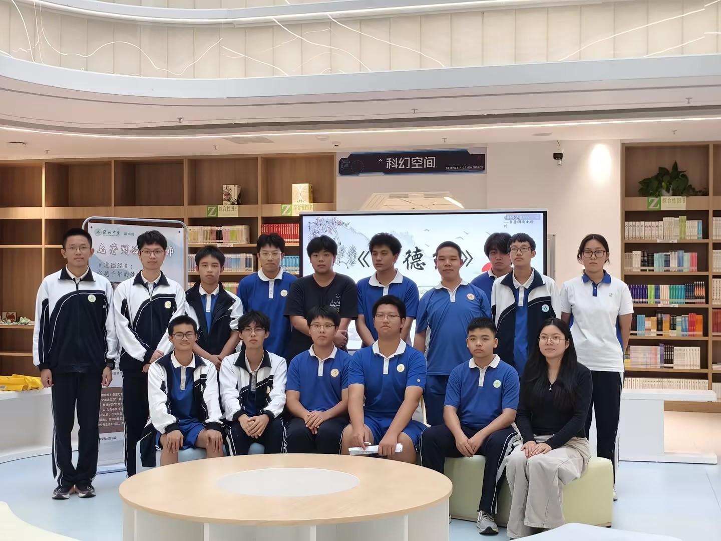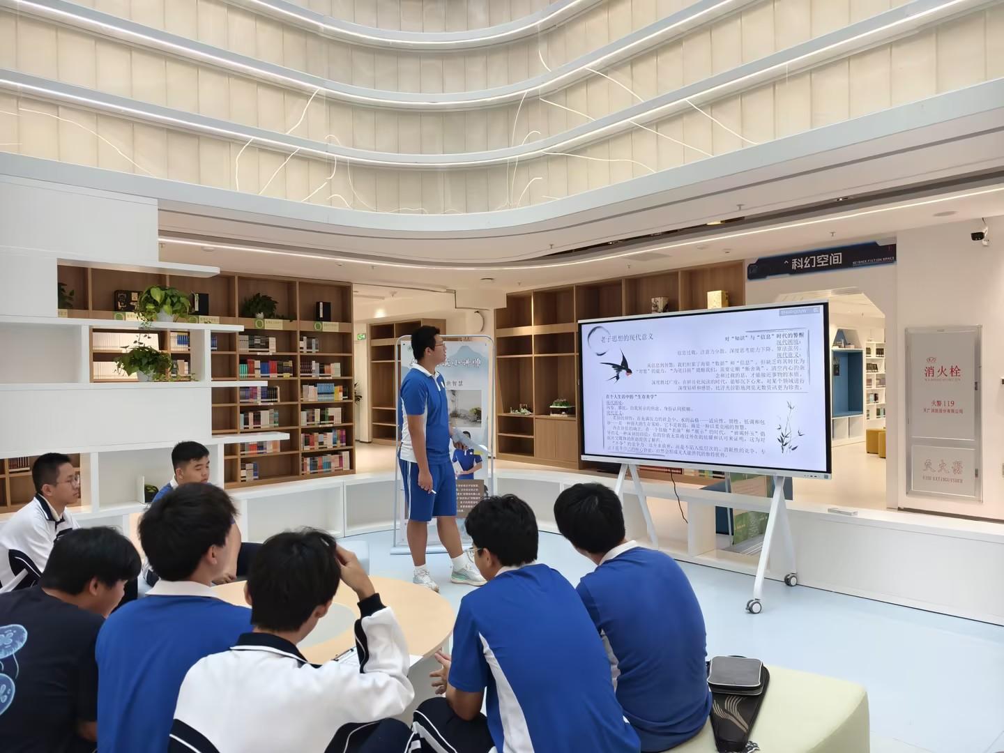 2025年11月12日下午四点,深圳中学图书馆二楼开放式中庭内,阳光透过玻璃穹顶洒下温暖的光斑,一场关于哲学、智慧与人生的深度对话即将拉开帷幕。高二(9)班的杨轹元同学站在中央,身后大屏缓缓亮起,映出“《道德经》——千年智慧之光”几个沉静而有力的大字。秋风轻拂,馆内座无虚席,同学们满怀期待,准备一同探索这部中华文明的智慧瑰宝。